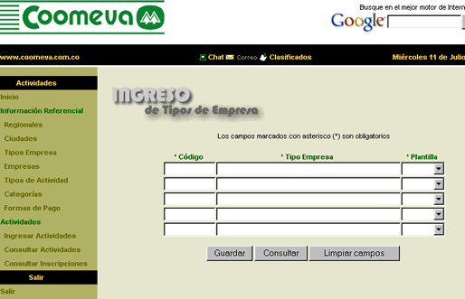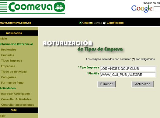 Regionales, ciudades, tipos de empresa, tipos de actividad, categorías