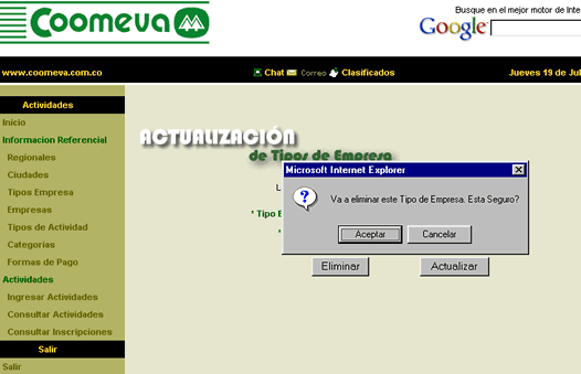 a ningún evento o convenio. Al intentar eliminar se muestra la