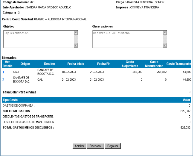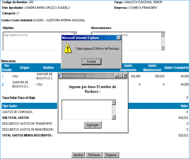 Gastos de Viaje, ingrese el Motivo del Rechazo y posteriormente,