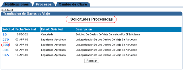 de las solicitudes realizadas, con la fecha de la solicitud, estado y su descripción.