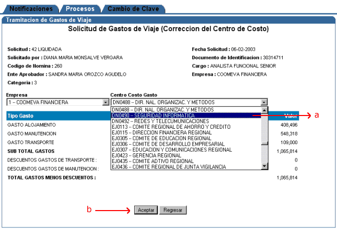 el nuevo Centro de Costos por el que va a viajar y con la letra b
