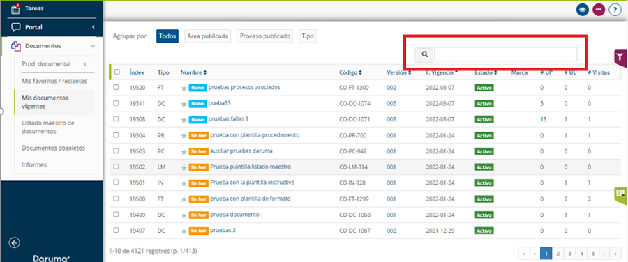Puedes buscar cualquier tipo de documento con la nueva opción de la lupa, ingresando el código y/o el nombre de documento a buscar