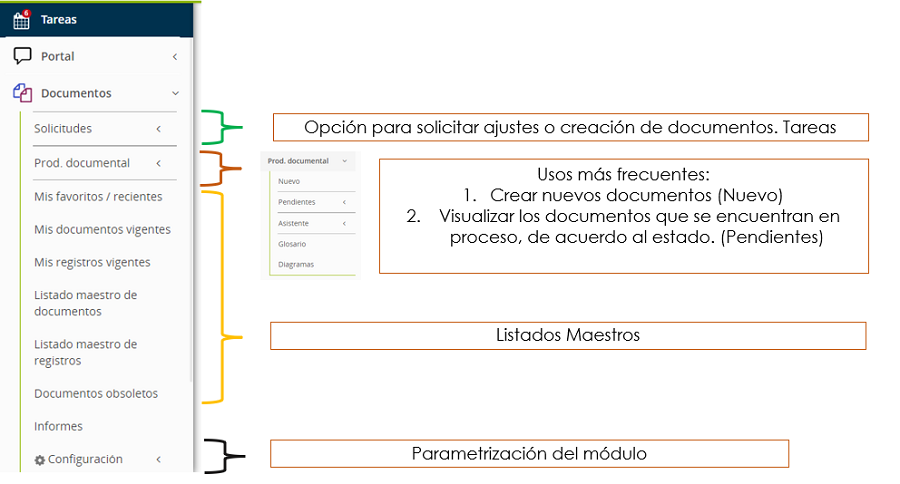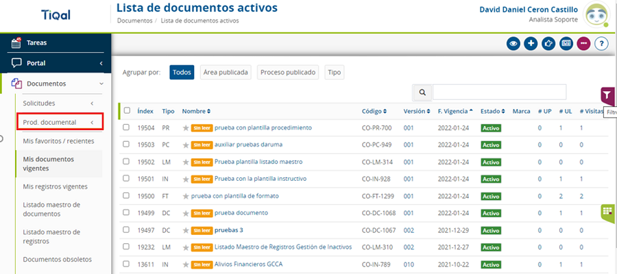 En la nueva opción Producción documental los líderes de procesos y/o aprobadores de procesos podrán visualizar los documentos que tienen pendiente por revisión y/o aprobación filtrando por tu nombre. De igual forma, en el módulo Tareas seguirán llegando las notificaciones de las acciones que tenemos pendientes por ejecutar en la plataforma